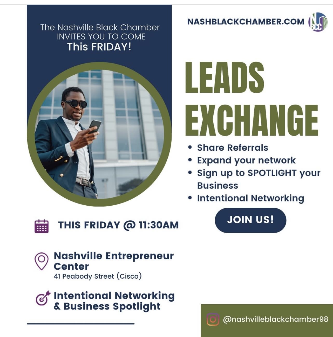 Come join us every Friday, LEADS XCHANGE at the EC at 11:30am. Our goal is to enable business owners and sales professionals to share referrals, Leads, make introductions and provide professional development to increase earning potential. We’ll meet at the Nashville Entrepreneur Center every Friday starting at 11:30AM. (Stay in the loop for exact mtg room). Register on Eventbrite. This event is free for Chamber members. Non-members get 2 free visits. Come network with intention and grow your biz starting! #nashvillebusiness #nashvilleblackbusiness #blackbusiness